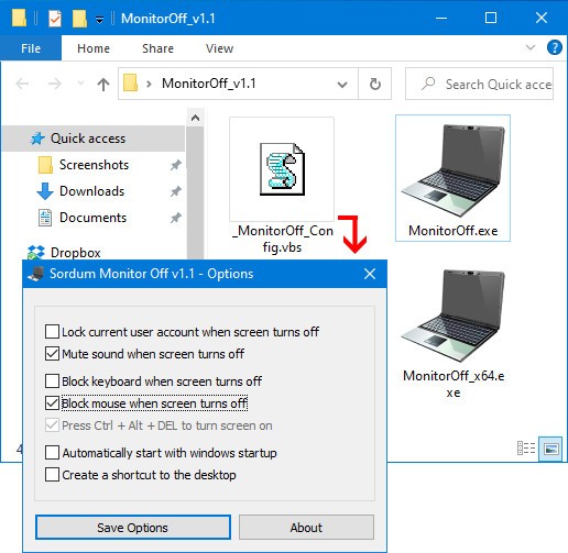 这个程序非常小,不需要安装(便携式免费软件)。你所需要做的只是运行可执行文件“Sordum监视器关闭”每当你想关闭你的屏幕。如果您想使用额外的功能,请运行“_MonitorOff_Config”。这将打开选项弹出窗口。