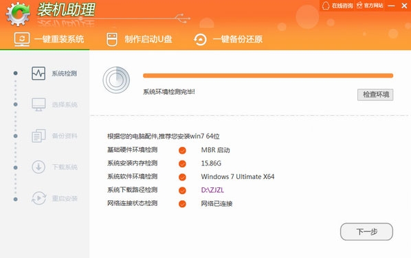 下载软件完软件后正常打开(“一键重装系统”),程序会默认检测当前系统环境,检测完成后,点击“下一步”。