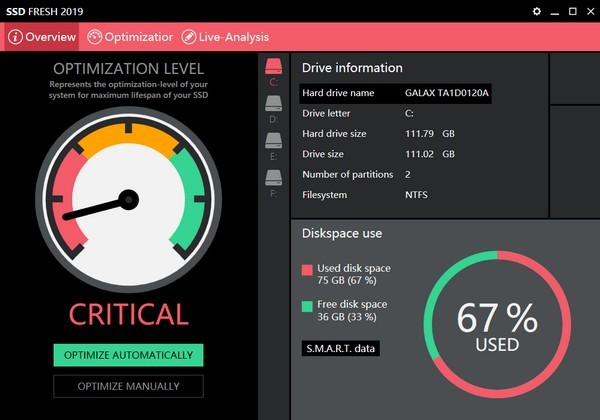 2019官方版可以帮助您优化您的系统,以使用SSD固态硬盘提高其整体性能,同时延长固态驱动器的寿命,是您硬盘维护的好帮手。