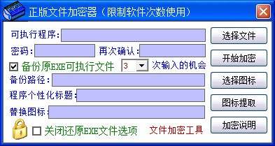 2005 最新增加EXE文件加密功能,它可以给任何EXE文件加口令(包括已经用其它任何工具压缩或加密过的EXE文件),您可以用来加密您的程序,只有您能使用,加密后完全独立运行,支持运行带有参数的EXE文件(如notepad.exe、QQ.exe等)、支持限制解锁口令次数、加锁界面个性化标题设置、XP界面加密后自身体积小、自身并带有解密、还原、备份功能,绝对不会破坏原文件,还有最重要的一点,它是完全免费的哦。