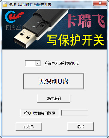 本写保护开关软件只是针对卡瑞飞U盘开发,应当对于其他U盘不能使用。将卡瑞飞指定U盘插入电脑,执行本程序,如下图。这是无写保护的状态,按“使F盘写保护”即可切换到写保护状态。