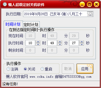 懒人超级定时关机软件官方版是一款十分好用的定时关机软件,懒人超级定时关机软件官方版支持定时重启、关机和注销,软件准确性高,操作简单,只需几步即可设置成功。如果你不能长时间呆在电脑前面,但电脑又在上传或下载文件之类的,那么这款懒人超级定时关机软件简直是你的福音。