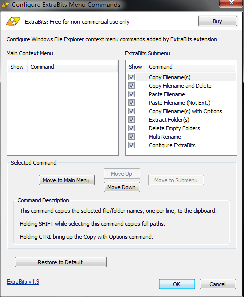 允许您配置显示哪些ExtraBits命令,以及它们是显示在ExtraBits子菜单中,还是显示在主上下文菜单中。这允许您隐藏您从不使用的命令,以避免混乱菜单。