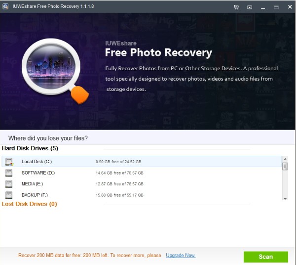 IUWEshare Free Photo Recovery正式版是一款功能出色,使用轻松的照片恢复工具。IUWEshare Free Photo Recovery正式版拥有清晰友好的界面,能够轻松恢复丢失的照片、视频和音频文件,恢复前大家还能够预览数据。