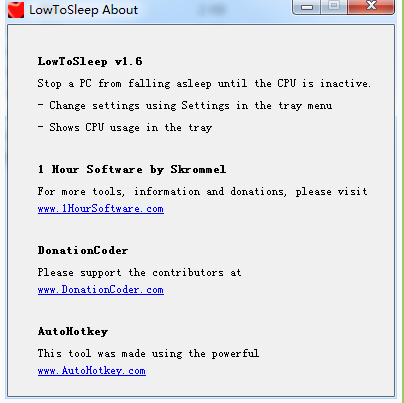 LowToSleep官方版是一款非常实用的防止系统休眠工具,LowToSleep官方版可以阻止电脑进入休眠状态,我们使用的windows操作系统,在对系统做任何操作的时候,系统将自动进入休眠状态,一是系统自身对电脑保护的方式,其次是节能;但有些时候系统进入休眠状态会给我们带来很大的不变,比如我们挂机下载某个附件,再或者游戏挂机,当系统自动休眠的时候电脑中运行的所有任务会自动停止,打开后,即使电脑长时间不操作,也无需担心会自动进入休眠状态。