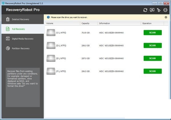 在开始扫描之前,请选择丢失数据所在的确切驱动器。如果您不确定文件的位置,可以使用“分区恢复”模式扫描整个驱动器。