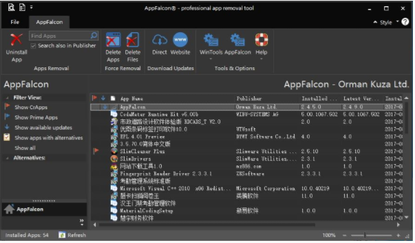 AppFalcon最新版是一款专业的电脑清理软件,AppFalcon最新版提供了软件分类查看功能,您可以根据删除软件的类型快速在本软件上找到他,并将其删除,同时,软件也会及时提供最近安装的程序列表,您当天安装的软件都会显示在里面,如果您需要删除的话,点击鼠标右键,弹出一个删除软件的提示,这时候点击删除,根据AppFalcon软件官方的卸载提示执行下一步,就可以将软件永久删除电脑了,并且对一些注册表以及组件也能实现永久删除!