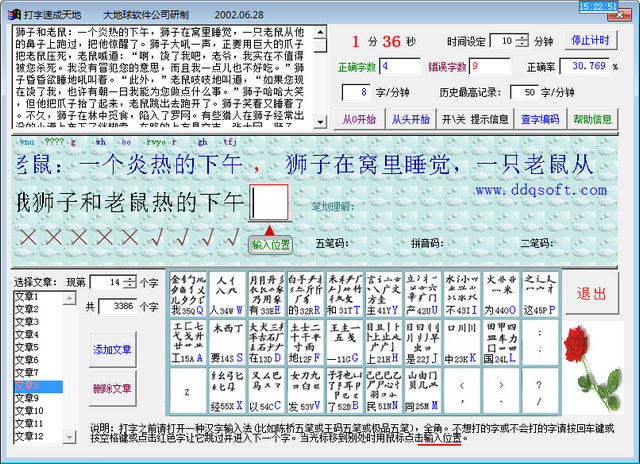 3、原配了12篇文章,共有2万多字,基本上包含了日常工作中常用的汉字,可选择不同文章练习,也可自己增添文章。