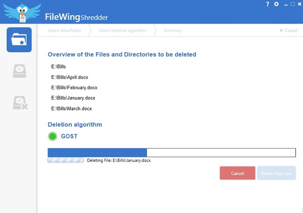 在FileWing Shredder中删除文件的算法是由安全专家开发的。它们经过科学验证和优化。数据将不可逆转地删除。