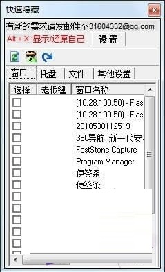 2、设置好之后,点击左上角的刷新按钮!会把现在电脑运行的所有程序列出来,在想隐藏的程序上打上勾!QuickHider支持多程序同时隐藏!按ALT+Z可以实现自身自身隐藏,然后用之前您定义的快捷键把刚勾上的程序隐藏吧!完全秒隐藏!