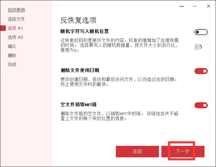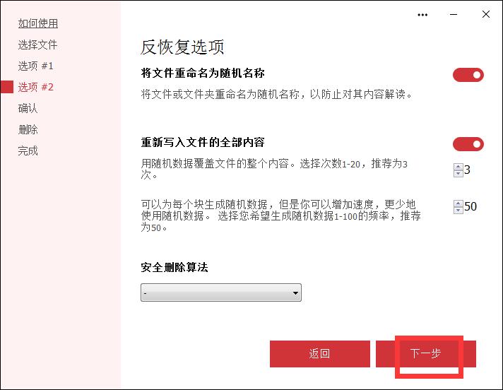 接下来我们可以选择是否对文件进行随机重命名、是否将文件内容完全覆盖。选择好之后点击下一步;