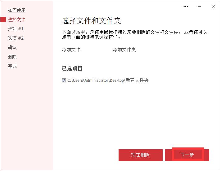 Deleter的主界面中看到准备删除的文件夹的路径。接下来我们要设置文件夹删除选项,点击Secure File Deleter主界面中的下一步;