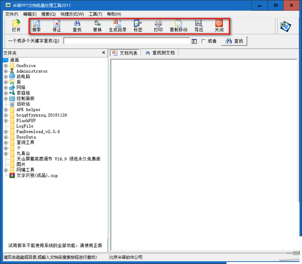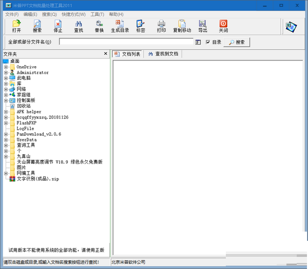 米普PPT文档批量处理工具绿色版是一款十分优秀的PPT文档处理工具,米普PPT文档批量处理工具绿色版支持文件名查找、文档浏览、文档快照、文档内容查找、文档拷贝、文档删除等多种功能。能帮助用户对文档进行处理和管理。
