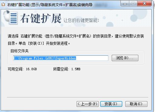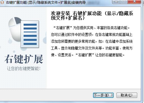 .bmp等,而恶意可执行文件往往是伪装成这些安全文件图标,让您误把病毒程序当成文本或图片之类安全文件打开,所以打开文件图标不可靠,必须看清文件扩展名。系统默认不显示文件扩展名,设置步骤繁琐,有了右键扩展功能一键搞定!显示/隐藏系统文件