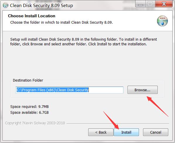 2、选择安装目的地,默认的是C:Program Files (x86)Clean Disk Security,可以点browse修改,之后点install开始安装