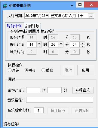 小俊关机计划软件电脑版是一款功能十分全面的脑定时关机软件,小俊关机计划软件电脑版拥有直观的操作界面,拥有时间计划和定时计划两种功能,可以实现定时关机、定时注销、重启、闹钟提醒、日历查询等,可自定义音乐,非常实用便捷。
