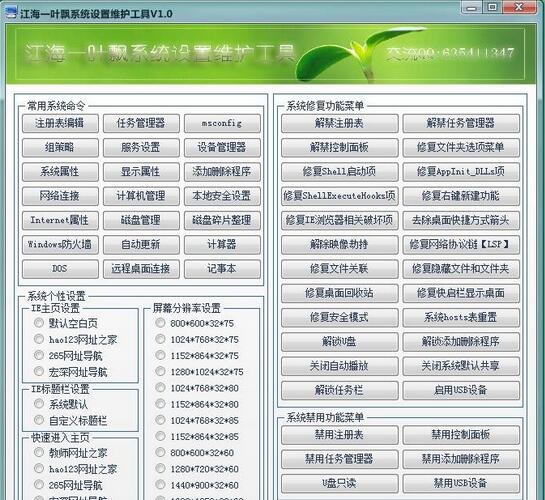 江海一叶飘系统设置维护工具最新版是一款简单实用的系统维护软件,江海一叶飘系统设置维护工具最新版内置强大的功能,拥有直观的操作界面,其软件主要用于电脑管理和维护,进行分辨率设置、系统个性化设置、系统修复、系统禁用等,内置丰富的系统常用命令,涵盖了几乎所有的系统维护功能。满足客户的需要。