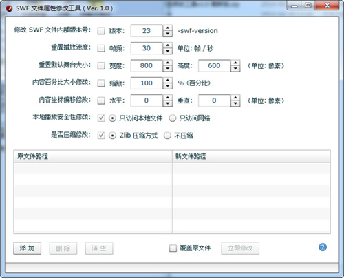 SWF 文件内部版本号,修改 SWF 文件的播放速度(即帧频),修改 SWF 文件默认的舞台大小。