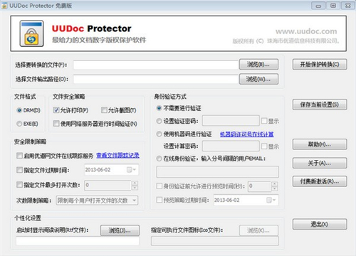 可设置是否允许打印、内容复制和屏幕截图,可以限制文档有效时间和打开次数,支持密码、机器码和Email身份验证;