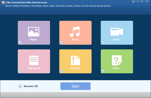 启动此程序时,首先要注意的是文件类型选择页面。所有常见的文件格式在此页面中分为6个不同的类别,包括照片、音乐、文档、视频、存档和其他。默认情况下会选中所有类别。只选择要检索的文件的特定类型将大大加快扫描速度。