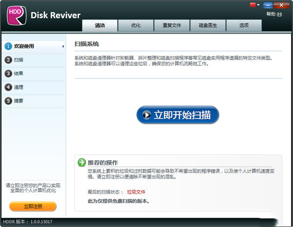 Reviver官方版界面简洁大方,功能强劲实用,操作方式简单,可以快速扫描系统中的垃圾、漏洞、重复文件和磁盘碎片,从而进行快速的清理。