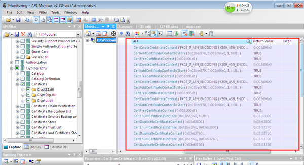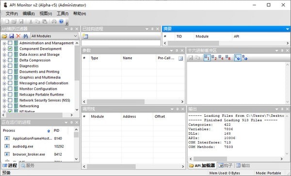 API过滤器分析器,包括句柄和对象,动态链接库,事件日志,管道和邮件槽,调试,Windows类,COMM,应用程序相关,外壳,对话框,文件系统,相关服务,远程访问服务,内存管理,打印相关,Windows,注册表,进程和线程,文件IO,WinInet,Windows套接字,多媒体API,Windows