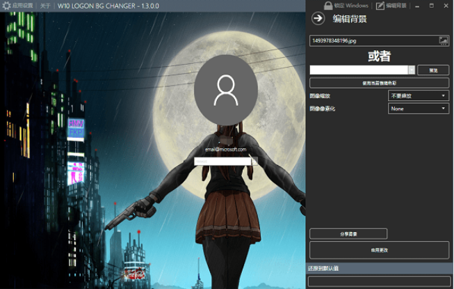 W10 LOGON BG Changer,通过这个工具,不但可以轻松修改win10的登录画面背景,还可以在更改前进行效果预览,图片调整等,而整个修改过程你只需要一张自己喜欢的图片即可。