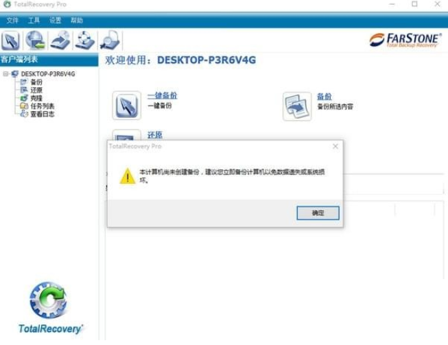 Pro软件,会弹出提示“本计算机尚未创建备份,建议您立即备份计算机以免数据遗失或系统损坏”,选择【确定】即可。
