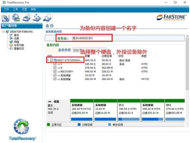 3,进入备份界面后,在任务名后输入备份的名字,默认以日期时间命名;备份内容一栏,选择整个硬盘,外接设备除外。