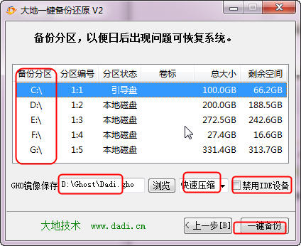 备份操作:选择GHO镜像保存目录,选择压缩方式(快速压缩、中等压缩、极限压缩),选择是否禁用IDE设备,设置完成后点击一键备份即可