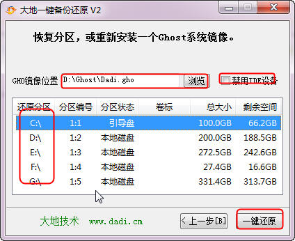 还原操作:选择需要还原的分区,选择GHO镜像目录,选择是否禁用设备,点击一键还原即可