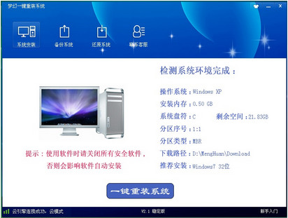 梦幻一键重装系统官方版是一款界面简洁、简单易用的系统重装软件,梦幻一键重装系统官方版集成目前网络上最好用的操作系统XP版本、win7版本,而且操作简单,只需一步,即可让任何人都可以免费给自己的电脑一键重装系统。同时梦幻系统能达到极加速80%、超稳定0丢包、全免费$0,让系统重装更快捷更简单。