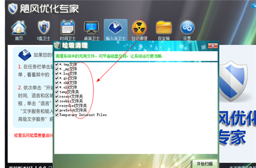 飓风优化专家的清理卫士分为三个方面:清理垃圾,清理痕迹,清理注册表。