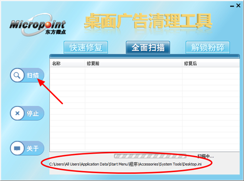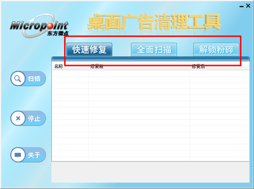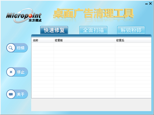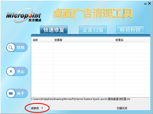 桌面广告清理工具官方版是一款功能齐全、数据丰富的桌面广告拦截软件,桌面广告清理工具官方版能够针对流氓软件在桌面上建立的顽固图标进行彻底清除,它可以帮助用户对存在于电脑桌面上的广告或者感染的顽固图标进行快速处理,整个处理过程非常简单,包括全面扫描、快速修复、解锁粉碎三个步骤!