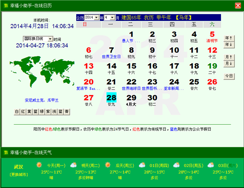 幸福小助手日历天气官方版是一款功能极为强大的桌面日历软件,幸福小助手日历天气官方版可以在桌面上显示天气、日历,使用幸福小助手日历天气不仅可以查看本地时间,同时还能查看国际时间,支持阴阳两历对照,查看传统节日方便,还能显示近来一个星期的天气预报。
