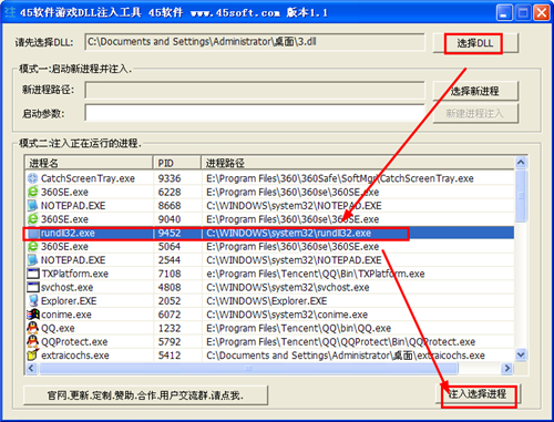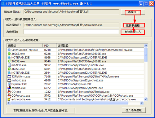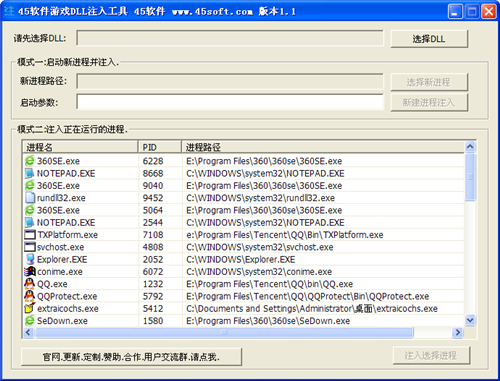 45软件游戏DLL注入工具官方版是一款简单方便的DLL注入工具,45软件游戏DLL注入工具官方版注入DLL文件有两种方法,45软件游戏DLL注入工具一是开启新进程并注入,二是直接在现有的进程列表中选择某个程序注入,注入后能够操作目标程序。