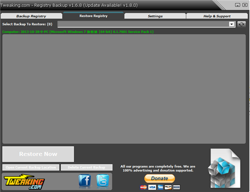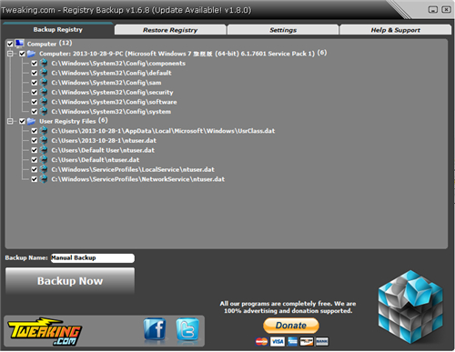 Tweaking Registry Backup官方版是一款非常方便,简单实用的注册表备份恢复工具,Tweaking Registry Backup官方版开启自动扫描系统注册表,可以将扫描到的注册表一键备份,当用户在清理注册表时,不小心误删了系统关键位置的注册表,工具也可以通过备份的注册表帮助用户恢复删除的注册表。