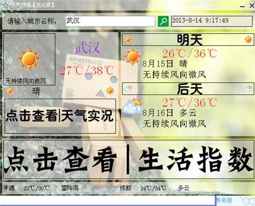 2、软件采用全球最大的中文气象网站数据,能准确预报全国3000多个县级地区,2小时自动更新天气数据,占用资源小,还有当前城市天气生活指数