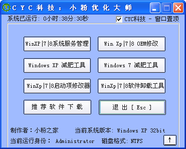 小粉优化大师官方版是一款界面精美的系统优化软件。小粉优化大师官方版通过本软件能进行winxp减肥、win7减肥、winxp/7/8/启动项的修改,更多功能欢迎下载使用。