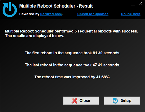 当你准备重新启动,按开始操作按钮太太会处理选定的预启动操作-如果有的话-然后进行第一序列的重新启动操作。每次电脑重启,太太会自动再次启动,显示计时器对话框。一旦个人电脑已经启动的时候,要求的数量,结果对话框然后显示相反。