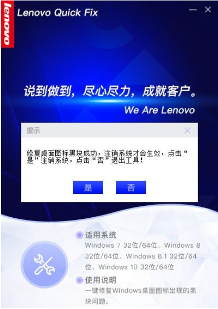 步骤2:点击“修复桌面图标黑块”运行工具,执行结束后,系统会提示“修复成功,需注销系统后生效的信息”,如图3所示: