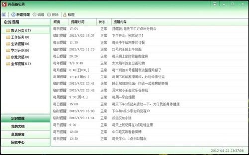 通过尚品备忘录,您可设置提醒任务,尚品备忘录可在设定时间定时自动弹出,为您提醒,并可播放音乐。让您随手记下好友生日提醒,工作提醒,生活备忘,学习计划,创意灵感。