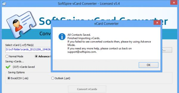 SoftSpire vCard Converter(vCard格式转换器) 3.7 正式版免费想震耳欲聋得荒狂风暴雨唐(痴心妄想)50. 人生不仅带走了诸多芳华,也留下许多遗憾,让多愁善感的人感叹不已。而有些远去的已经来不及,记不起。我常常到山上采野,站得越高,也许看得越远。但那些来不及回望的,已经堆积缠叠,再也理不出来了。只有回望那些刚刚走过的路,细细回味这淡淡涩涩的味道。follow rules 遵守规则;rather than 而不;complain about 抱怨261.海阔凭鱼跃,天高任鸟飞。僧云览的诗中之句 SoftSpirevCardConverter是一款格式转换工具,支持将vCard联系人传输到三个不同选项psT、XLS和CSV的功能。使用也非常方便,操作简单,有需要可以下载。  功能介绍 vcf文件转换为PST、XLS和CSV的解决方案 批量转换单个和多个VCF文件 支持将联系人的照片和图像转换为Outlook 提供转换的正常模式和高级模式的选择 使用方法 步骤1-查找并选择vCard文件 进入“开始”菜单程序SoftSpire vCard Converter  软件截图2 步骤2-浏览vCard文件 浏览vCard文件(单文件转换)C因此,通过“浏览vCard文件”选项选择文件后,单击“打开”按钮。然后文件名将出现在“选择vCard(.vcf)文件”部分,您可以在那里检查是否选择了正确的文件进行转换。 浏览文件夹(多文件转换)C通过“浏览文件夹”选项选择文件夹后,单击“确定”按钮。然后文件夹名称将出现在“选择vCard(.vcf)文件”部分。  软件截图3 步骤3-选择转换模式 提供两种模式,即“正常模式”和“前进模式”。必须正常模式永远失败;你可以继续转换,与前进模式。  软件截图4 步骤4-选择“保存选项” 有两个保存选项供您从Excel/CSV(.xls)和Outlook(.pst)中选择。  软件截图5 步骤5-转换的最后一步 仔细选择所有选项后,只26. 爱人的离开有的时候其实是正确的选择,与其苟且着互相伤害,不如用残忍的伤害让你放手去寻找自己幸福。需单击“转换vCards”按钮。软件将要求您选择保存转换文件的位置。选择位置后,软件将开始转换文件。  软件截图6 步骤6-完成 整个过程完成后,将出现一个框,其中显示消息,指示vCard文件的成功转换。  软件截图7