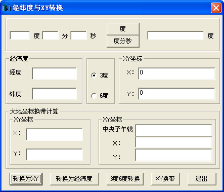 转换为XY、转换为经纬度、3度6度转换、XY换带、退出、