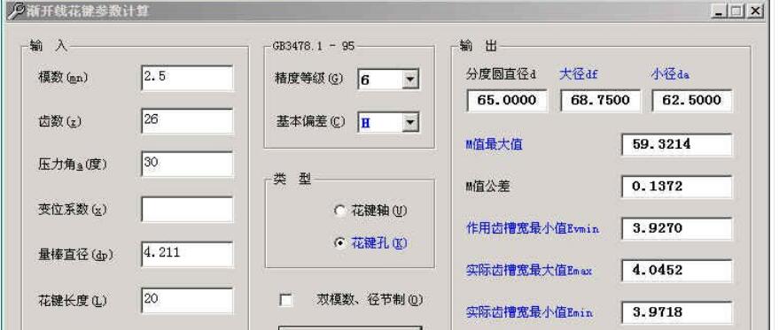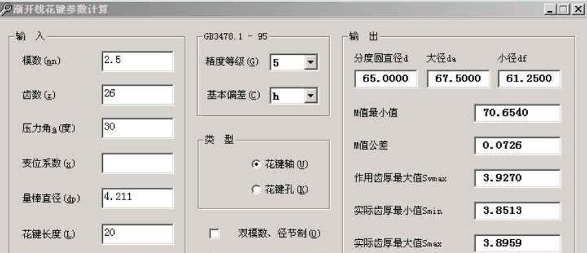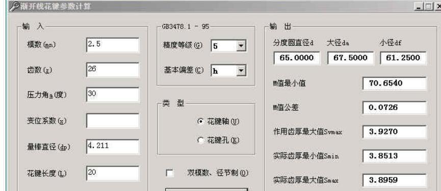 说明一点的是:计算双模数花键时,在“双模数、径节制”前面打上勾,按提示输入较小的模数值(径节要转换为模数后再输入)(较小的模数一般是计算齿高的)。