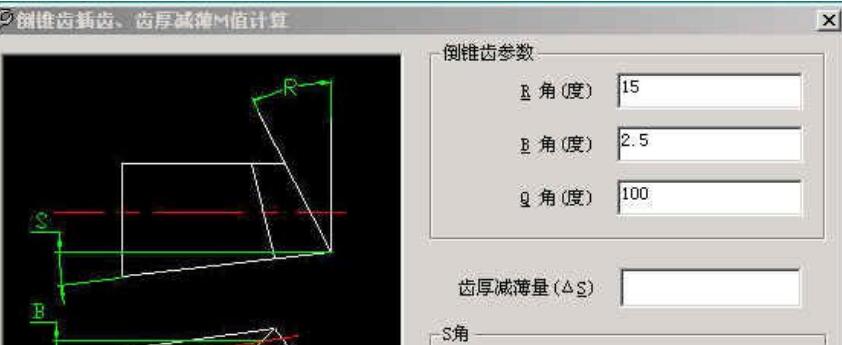 如上图:输入R角、B角、Q角,即可计算出S角(插倒锥齿时插齿机工作台倾斜的角度),按“计算补偿变位系数”即可计算出补偿变位系数并传递到渐开线花键计算主窗口,再按计算就得到了插倒齿时的花键参数。