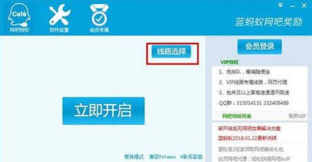 1、打开桌面上的蓝蚂蚁QQ金牌网吧特权奖励软件,弹出界面点击“线路连线”,选择蓝蚂蚁的使用路线