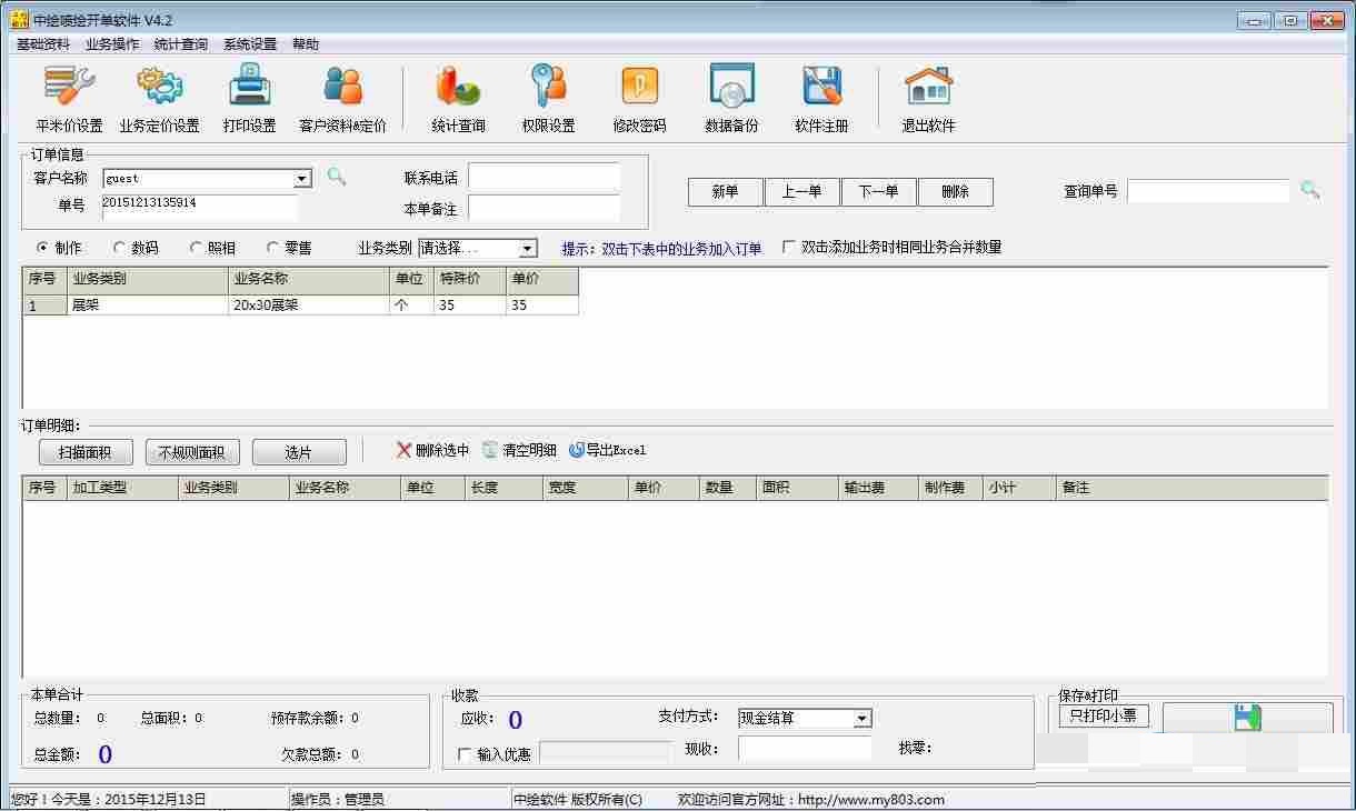 2、扫描面积开单:对选中文件夹进行自动扫描识别图片尺寸,并计算面积,总价,扫描结果加入订单。