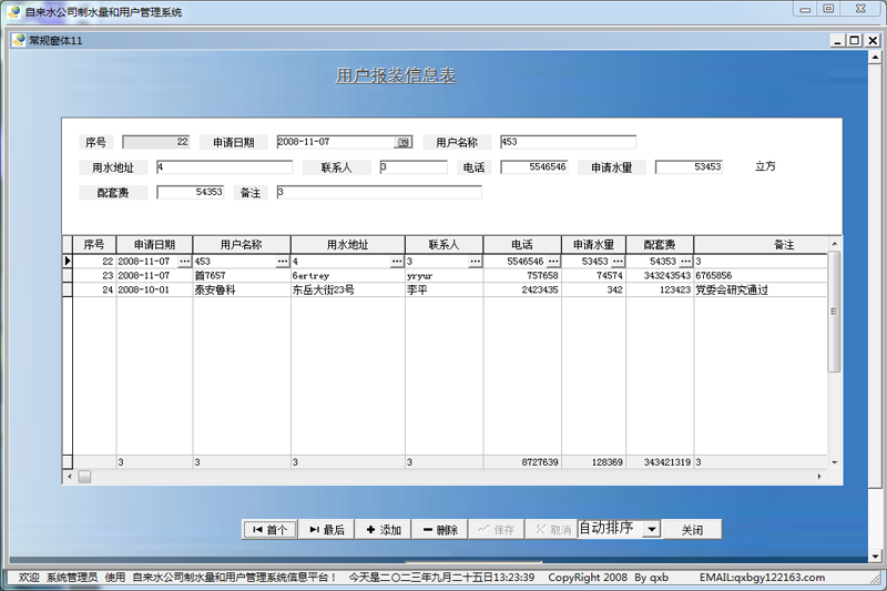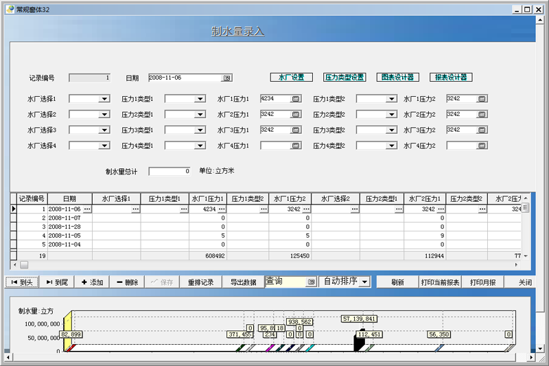 自来水公司制水量和用户管理系统拥有数据录入查询、图表报表全部自动生成、采用水厂设置、压力类型设置、图表设置、报表设置等设置、可由用户自由设置。是自来水行业的首选工具。