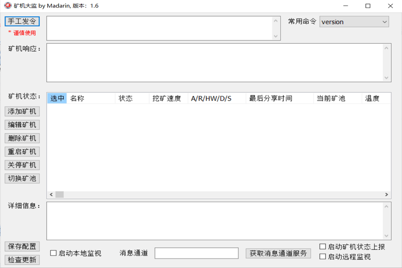 矿机监控软件官方版是一款使用起来十分安全可靠的主要针对PC端所打造的监控软硬件矿机运行状态的工具。矿机监控软件官方版操作也是十分简单,支持局域网(内网)监控和广域网(远程)监控;可以对矿机进行任意的重启、关停、切换矿池等实用的操作。矿机监控软件还可以对局域网、广域网里面进行运行的矿机进行查看工作的状态,也可进行快速的监控,轻松的即可发送需要的指令等。